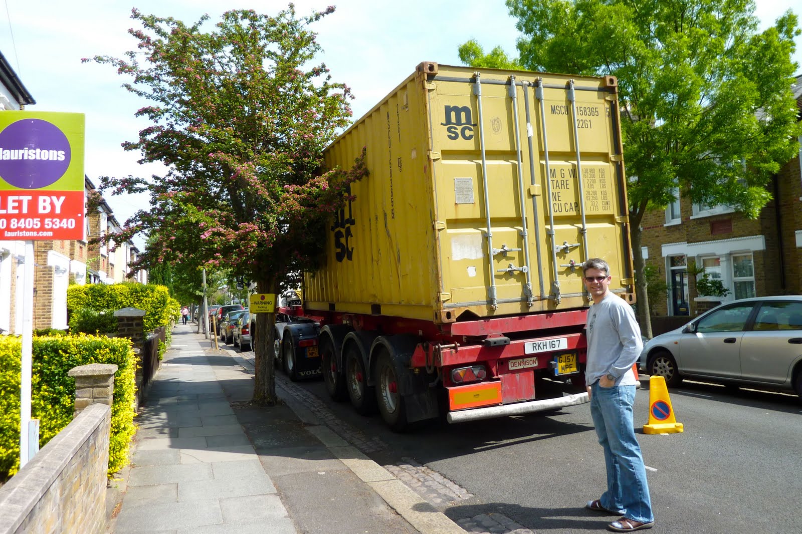 Tuesday morning we got a call from the delivery company saying they'd be at the house on Florence Road between 1 and 5 pm. I was hoping it would be earlier in the day, since we had to meet the inventory clerk from the letting agent and a representative of the property search company there at 10 am to get the keys and do a walk-through of the house. Oh well. Good thing I'm unemployed. This was the first chance we had to really take a good look at the house, since the owners (and all their stuff) were there on our previous two visits. This time we were able to open kitchen cabinets and drawers, peek inside closets, and make sure the toilets flushed properly. After seeing how narrow the halls, stairs, and doorways are, I'm convinced it will take nothing short of a miracle for all our stuff to fit. I hope the movers have lots of experience working in tight spaces.